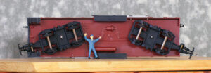 台車をみると・・・ナローで軌間幅がすかすかなので、32mm軌間台車をはかせることが可能のようだ;
