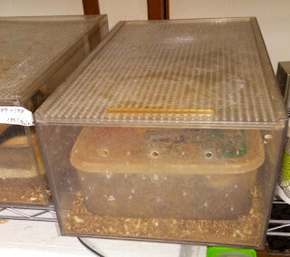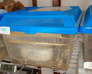 babyとか、交配待ちの個体たちは、色の派手なplastic製ケースに収容している。天井が低くて可哀想ではあるが、仕方ない。成体になるとほとんど運動スペースがない。babiesの頃から収容して成長するまで、運動させるのが・・・せめてもの・・・。